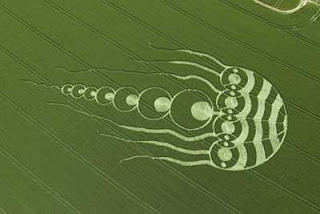 This crop circle has a length of 600 feet and appeared in the wheat fields Kingstone Coombes, Oxfordshire on June 1, 2009. This pattern is considered to be the longest of the whole crop circles ever to appear. Previously appeared pattern of butterflies and bird patterns, but this is the pattern of the first jellyfish in the world. The size is about 3 times larger than the usual crop circles. It's really a monster.